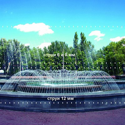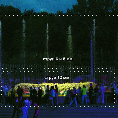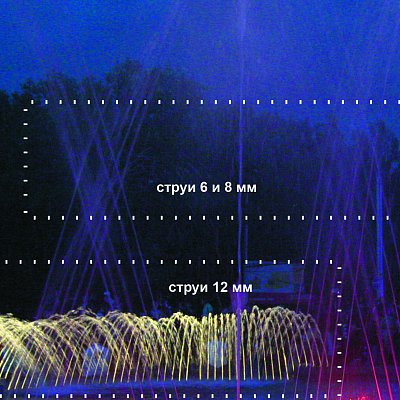 Тонкие струи малозаметны как в светлое, так и в темное время суток, и неспособны сформировать сколько-нибудь красивый водный рисунок. Это особенно хорошо заметно вечером при включенной подсветке. Тонкие форсунки выбрасывают в воздух настолько малое количество воды, что даже мощные прожектора не могут создать эффект свечения водных струй и капель. Наглядный пример на фото: ярко светящиеся струи нижнего ряда образованы форсунками 12 мм, струи верхнего ряда создаются форсунками 6 и 8 мм и практически не видны в темноте.