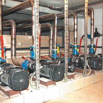 На приведённых фотографиях ниже - насосная станция с «сухими» насосами консольно-моноблочного типа и светодиодные 12-вольтовые прожектора, смонтированные по всем правилам.